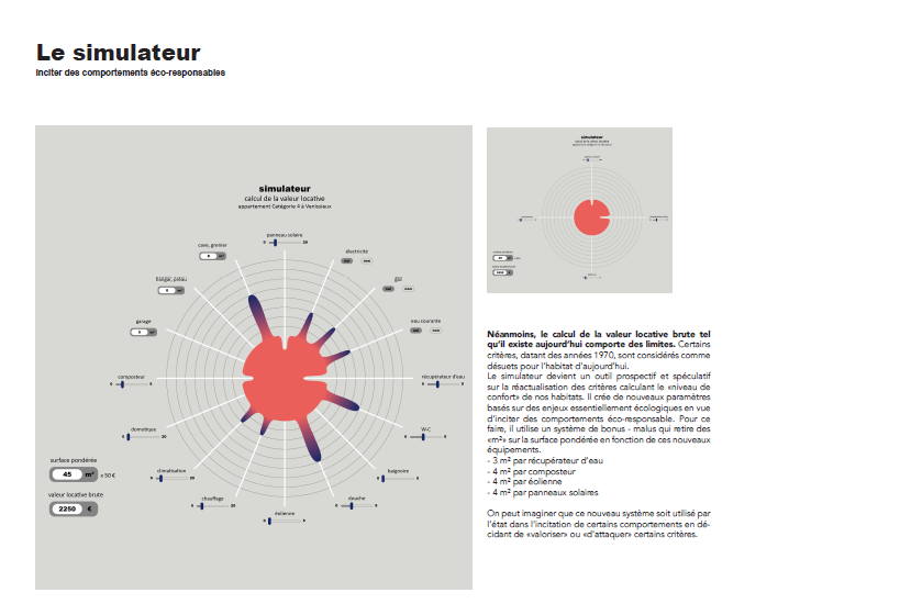 Après quelques jours de travail, à tenter de comprendre le calcul de la valeur locative (qui repose sur une catégorisation des immeubles en fonction de leur qualité et selon chaque commune, ainsi que sur sa surface pondérée selon plusieurs critères comme un certain niveau de confort dépendant d’une grille qui date des années 70), les étudiants ont fait plusieurs propositions spéculatives d’amélioration, consistant à personnaliser la feuille d’imposition, à proposer une chaîne d’explication graphique permettant d’interagir – de zoomer et dézoomer – avec sa compréhension et de voir l’impact de son logement, de son foyer et du territoire sur le calcul de ses impôts locaux. Les étudiants ont également imaginé un simulateur permettant de jouer sur la surface pondérée du calcul de la valeur locative en fonction des équipements. Un simulateur permettant de réactualiser les critères de calcul en imaginant y intégrer de nouveaux paramètres (notamment écologiques) permettant de faire diminuer la valeur locative selon des critères écologiques. L’enjeu : favoriser la transition écologique et permettre aussi aux communes et intercommunalités de valoriser des critères environnementaux qui leur sont spécifiques ! Une proposition où simulation, explication et jouabilité fonctionnent de concert pour créer à la fois de la responsabilité et une nouvelle grille d’enjeux pour les impôts locaux.