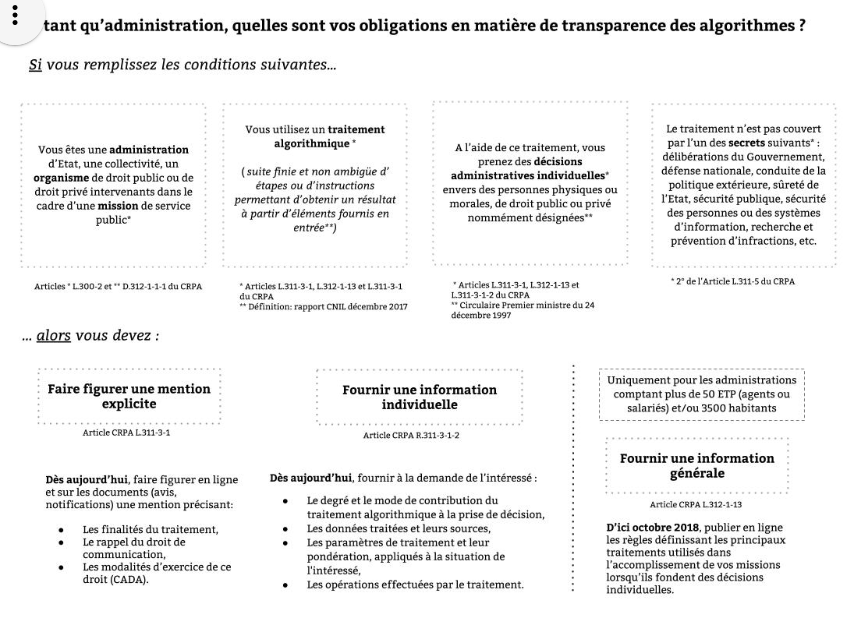Image : les obligations légales des algorithmes publics synthétisés en une image par Simon Chignard et Loup Cellard.
