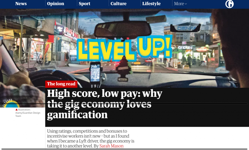 Dans les années 70, le sociologue du travail britannique Michael Burawoy, dans son livre Produire le consentement (1979, traduit en français en 2015) constatait que si les travailleurs consentaient à leur propre exploitation, c’était en fait surtout par jeu. Burawoy expliquait que lorsque le travail prenait la forme d’un jeu, la principale source de tension n’était plus dans la relation des travailleurs avec les dirigeants, mais s’étendait aux autres travailleurs, aux machines et contre eux-mêmes. En proposant un sentiment d’autonomie et de contrôle relatifs, la ludification propose aux travailleurs de souscrire aux objectifs de l’entreprise. Lyft propose ainsi des défis à ses conducteurs en échange d’une prime supplémentaire : des défis assez difficiles à décrocher qui reposent sur le nombre de courses à réaliser à certains créneaux horaires. En plus d’inciter les conducteurs à se rendre où l’entreprise en a le plus besoin, l’un des principaux objectifs de cette ludification est la rétention des travailleurs. Elle ne fonctionne pourtant pas si bien. 50 % des conducteurs de Uber cessent d’utiliser l’application au bout de deux mois. 4 % des conducteurs le sont encore après une année. Des rapports récents estiment que le revenu des chauffeurs à l’heure est souvent inférieur au salaire minimum.