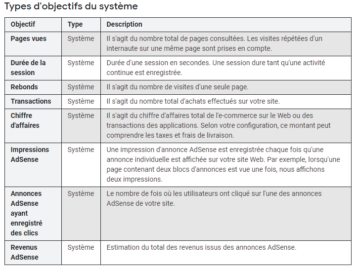 Image : la grille d’objectifs des tests A/B par Google Optimize.Ces tests posent des questions sur l’efficacité mesurée : bien souvent, on s’attache à une amélioration, même faible ou peu distinctive, mais sans voir l’impact de ces transformations sur ce qui n’est pas mesuré. Ainsi, les tests peuvent vous montrer qu’une fonctionnalité (comme le fait que vous voyez que votre interlocuteur a vu votre message ou que vous voyez qu’il va vous répondre dans une messagerie instantanée, fonctions qui se sont généralisées via ces techniques de tests utilisateurs) est appréciée, fonctionne plus que la précédente (les gens restent plus longtemps dans l’interface), sans mesurer les autres transformations qu’elle induit (la raison pour laquelle ils restent dans l’interface, le fait que finalement, cette capture, si elle est immédiatement efficace en temps passé, ne l’est pas sur le long terme dans la transformation des rapports humains qu’elle induit).