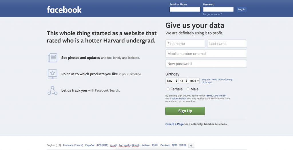 Image : Le travail de la designer Kalli Retzepi, sous forme de propositions critiques, met en évidence les divergences entre les modèles économiques des entreprises de service et les promesses faites aux utilisateurs. À quoi ressemblerait Facebook, par exemple, s’il apparaissait à nous de façon intelligible quant à ses intentions ? Via un, tweet du 15 novembre 2018.