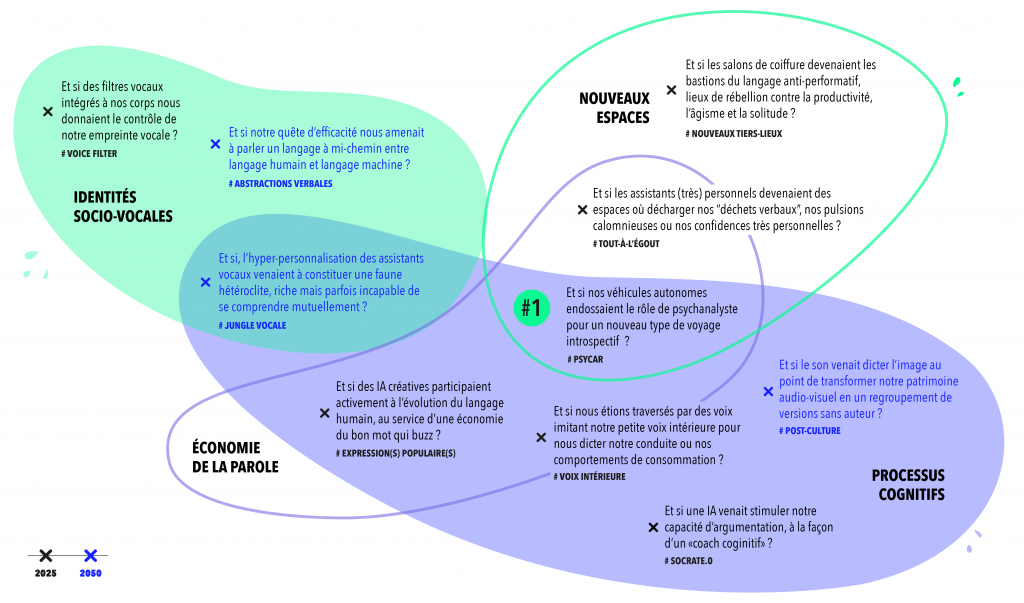 Image : cartographie de scénarios d’enjeux prospectifs de la parole par Postillon Prospective.