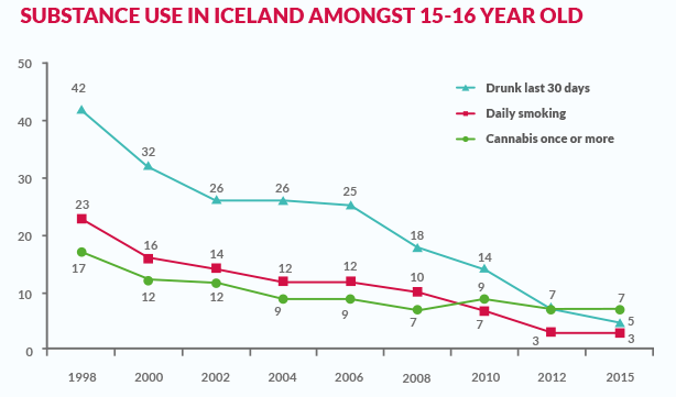 Au début des années 2000, l’Islande a lancé un programme intitulé Jeunes en Islande (Youth in Iceland). Ce programme a interdit la vente d’alcool et de tabac aux plus jeunes ainsi que leur publicité. Il a également renforcé le lien entre l’école et les organisations de parents d’élèves, invitant les parents à des conférences sur l’importance à passer du temps avec ses enfants et à leur parler. Une loi a également interdit aux plus jeunes de sortir le soir, après 10h en hiver et minuit l’été. Ces innovations ont eu pour effet à la fois d’éduquer les parents et de les aider à réaffirmer leur autorité à la maison. En même temps, l’Etat et les collectivités ont augmenté le financement des activités culturelles et sportives pour les adolescents. A Reykjavik, la capitale, une carte offre à chaque parent l’équivalent de 290 euros d’aides pour financer les activités des adolescents. Dans le même temps, les études ont continué à mesurer l’évolution, montrant que non seulement les addictions chutaient, mais également que le temps passé par les parents avec les enfants en semaine doublait et que l’activité sportive s’améliorait.