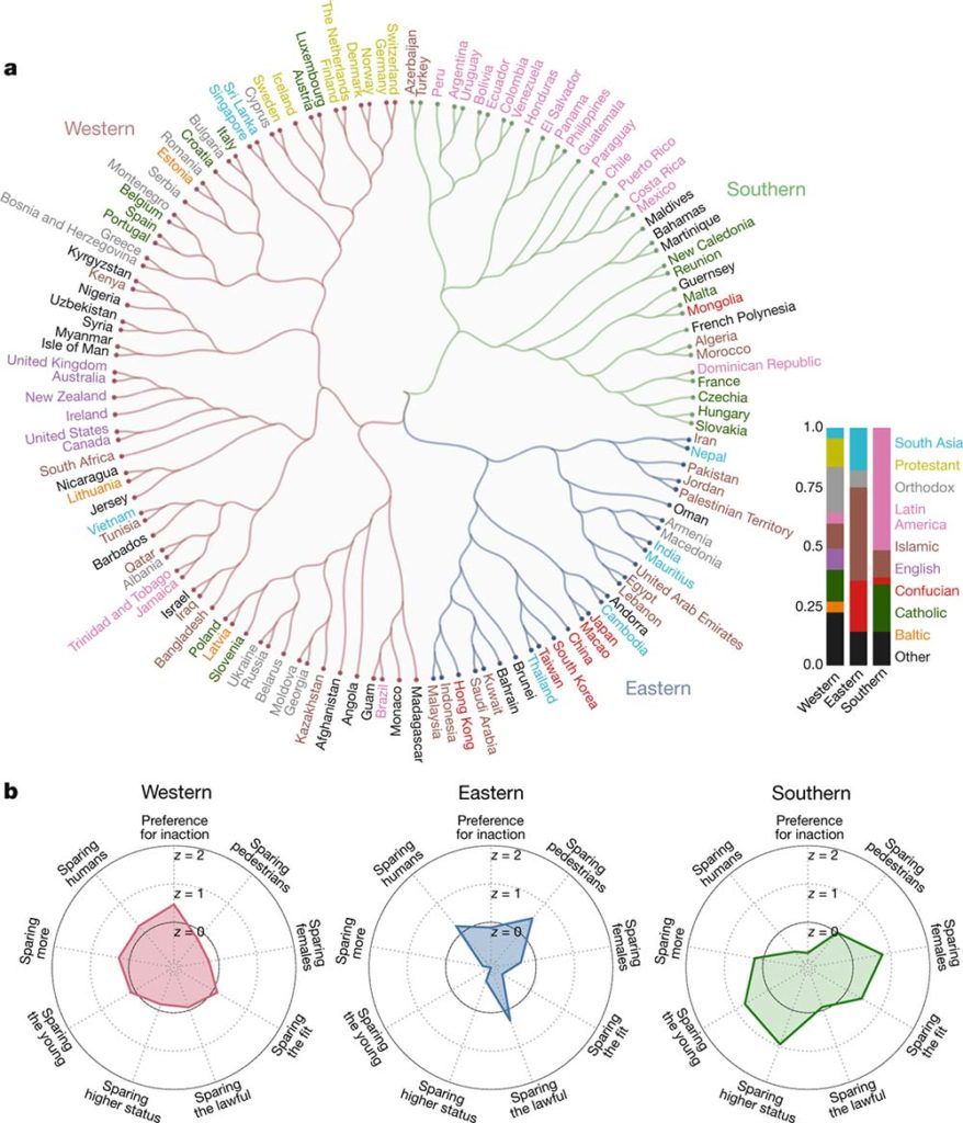 A un niveau plus global, les chercheurs ont mis à jour ce qu’ils appellent trois grands groupes moraux au niveau mondial : un groupe occidental (comprenant les Etats-Unis et la plupart des pays Européens protestants, orthodoxes et catholiques) qui expriment une préférence pour l’inaction, pour épargner des humains, les groupes plus nombreux et les plus jeunes ; un cluster oriental très large allant de l’Extrême-Orient à l’Arabie saoudite, du confucianisme aux pays islamiques, qui exprime une préférence pour épargner les piétons et ceux qui respectent les règles ; et enfin un groupe méridional qui comprend les pays d’Amérique Centrale et du Sud ainsi que la France métropolitaine et les pays d’ancienne influence française, avec des caractéristiques de réponses morales qui privilégient le fait d’épargner les plus jeunes, les gens avec un statut élevé et les femmes !