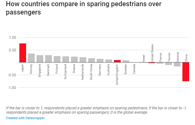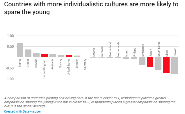 Une autre partie de l’étude, sur laquelle revient plus largement la Technology Review, s’intéresse, elle, aux résultats par pays, selon des facteurs culturels et économiques, qui distinguent des préférences morales différentes selon les cultures individualistes ou collectivistes. Les pays qui ont une tendance individualiste expriment une préférence pour épargner le plus grand nombre de personnes, alors que les pays plus collectivistes manifestent une préférence moins marquée pour épargner les enfants. Pour les chercheurs, ce clivage entre pays individualistes et collectivistes est un obstacle important à une éthique universelle des machines.