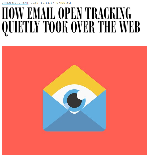 Sur Wired (@wired), Brian Merchant (@bcmerchant), l’auteur de L’appareil unique, l’histoire secrète de l’iPhone, revient en détail sur le développement du pistage de nos e-mails. Pour son enquête, il a utilisé Streak, un outil qui s’interface avec sa messagerie et qui permet à tout utilisateur de savoir si ses correspondants ont ouvert leurs e-mails. 40 % des e-mails envoyés seraient pistés, selon une étude faite par une entreprise qui propose des outils pour s’en protéger, One More Company, la société qui est derrière Senders et evercontact.