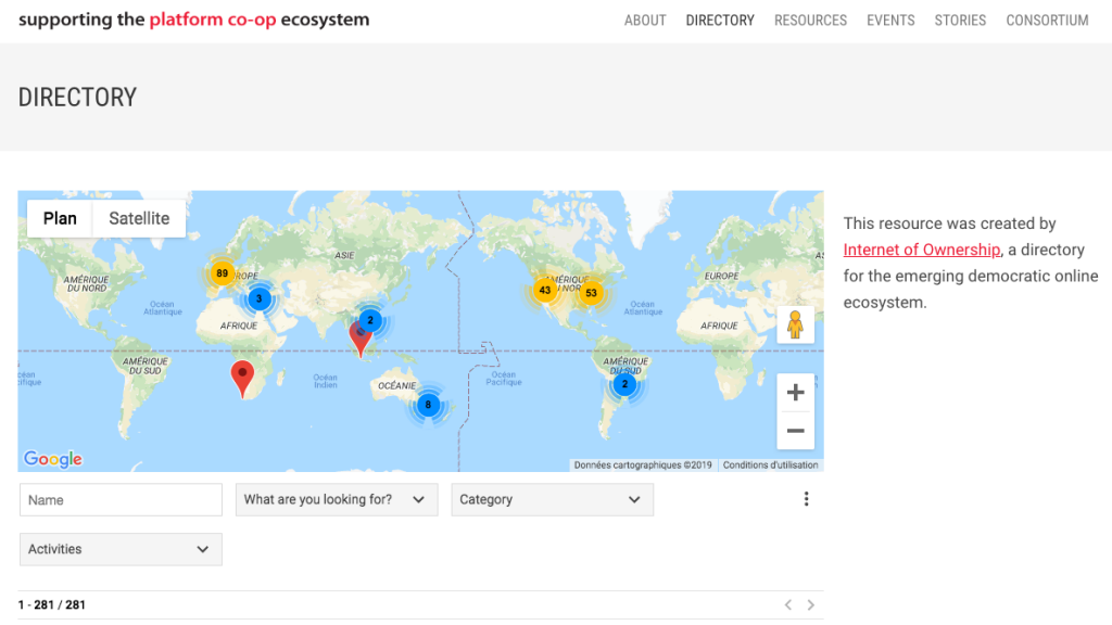 Image : la carte et la liste des 281 plateformes coopératives recensées par Platform.coop.