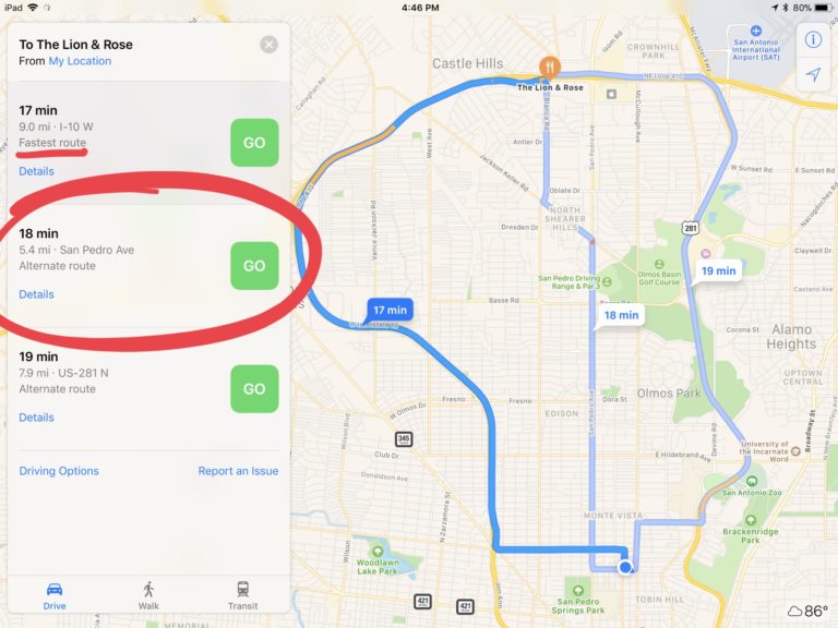 Michael possède un véhicule hybride, une Chevrolet Volt. Pour surveiller sa consommation électrique, il dispose d’un tableau de bord précis qui lui montre par exemple que sa batterie se vide bien plus rapidement lorsqu’il roule plus vite, à 120 qu’à 100 km/h. Or, il a remarqué que les GPS qu’il utilise ont toujours tendance à lui proposer les itinéraires les plus rapides, c’est-à-dire ceux qui passent par les voies les plus rapides. Pour se rendre à son restaurant préféré, Apple Maps et Google Maps l’envoient tous les deux sur la voie rapide, lui faisant faire des itinéraires entre 14 et 12 kilomètres. Or, s’il prend la route la plus courte, sans passer par les voies rapides, il ne fait que 8 kilomètres, mais met 1 à 2 minutes de plus. Or, a-t-il calculé, s’il utilise la route la plus rapide et qu’il va plus vite, sa voiture va consommer bien plus d’énergie que s’il prend la route la plus courte. Il échafaude ensuite, via un rapide calcul, que baser les GPS par défaut sur l’économie d’énergie plutôt que la vitesse permettrait d’enlever de la circulation l’équivalent annuel de quelque 800 000 voitures aux États-Unis.