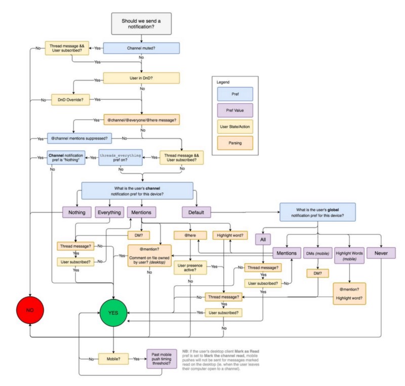 En attendant ces systèmes, à court terme, les entreprises devraient activement réfléchir à une meilleure logique de notification. Prendre le temps et soin de créer des systèmes de notifications corrects est un élément différenciant important, estime le développeur. Dans ce cadre, la simplicité est souvent insuffisante, rappelle-t-il en pointant vers l’arbre décisionnel de la plateforme de travail collaboratif Slack pour savoir s’il faut ou non notifier un client.