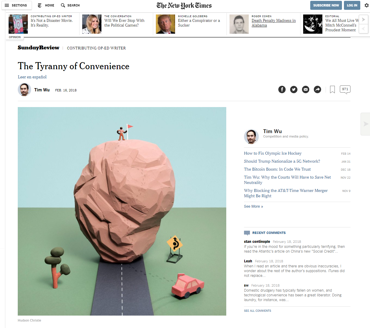 « La commodité est la force la plus sous-estimée et la moins comprise dans le monde aujourd’hui ». Certes, elle est ennuyeuse, mais elle est un puissant moteur des décisions humaines, bien plus que le désir ou que la récompense, estime le juriste américain Tim Wu (@superwuster), dans une remarquable tribune pour le New York Times. « Elle est pourtant la force la plus puissante qui façonne nos vies et nos économies ». La commodité semble prendre nos décisions pour nous, nous faisant souvent remiser nos véritables préférences au profit du facile voire du plus facile. La commodité transforme nos options et nos opinions. Une fois que vous avez goûté à la machine à laver, laver ses vêtements à la main semble être une tâche irrationnelle. Une fois que vous avez goûté à la télévision en streaming, attendre pour regarder un film semble stupide. Résister à la commodité, comme ne pas posséder de smartphone, semble même en passe de devenir une excentricité, voire de relever du fanatisme. Notre goût pour la commodité en engendre toujours plus : plus il est facile d’utiliser Amazon et plus Amazon devient puissant et plus il est encore plus facile d’utiliser Amazon. La commodité est l’allié naturel du monopole, des économies d’échelles et du pouvoir de l’habitude.