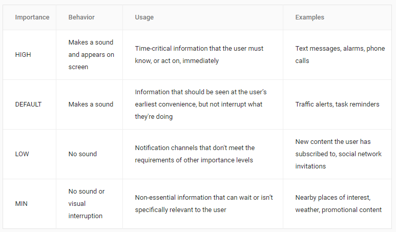 Tableau : les 4 niveaux d’importance des notifications selon le guide des développeurs Android.