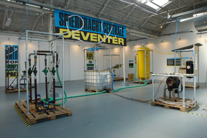 Ces constats n’ont pas été sans impacts sur les prototypes mis au point par Kris de Decker et Melle Smets. Leurs dispositifs se font face pour permettre aux utilisateurs de se parler. Au centre est disposé un jacuzzi à la fois pour la convivialité et à la fois pour une raison technique : en effet, le choix d’une solution hydro-pneumatique nécessitait de pouvoir déverser certains trop plein du circuit fermé d’eau sous-pression produite par l’énergie cinétique des appareils de gym. Le but également de ces circuits hydrauliques : rendre l’énergie produite visible et produire l’électricité la plus écologique possible.
