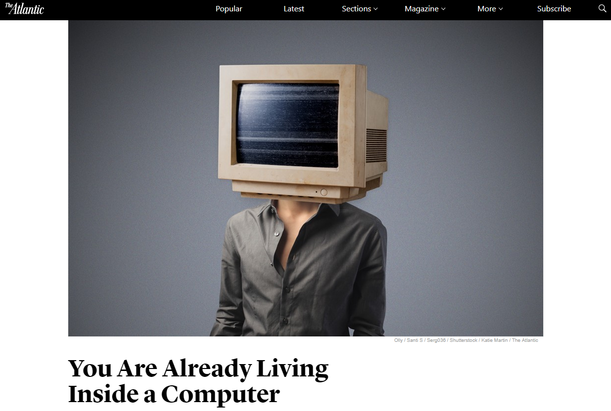 Le concepteur de jeux et essayiste Ian Bogost (@ibogost) est toujours un esprit pénétrant. Pour The Atlantic (@theatlantic), il développe une longue et passionnante argumentation pour nous expliquer pourquoi nous vivons déjà dans un ordinateur.