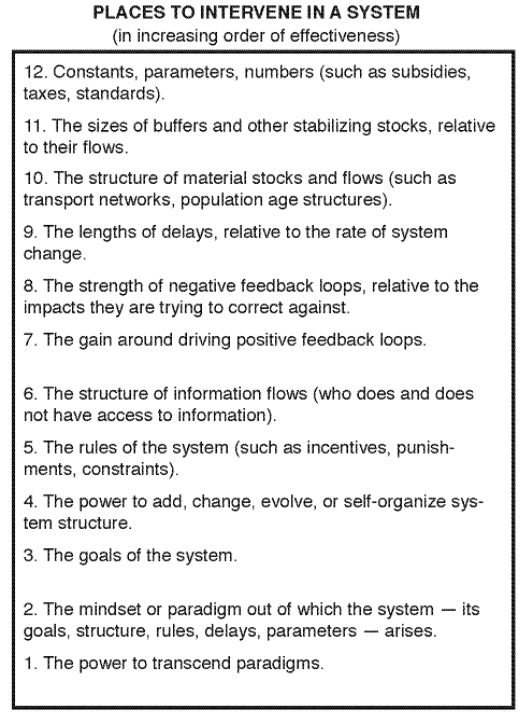 Image : les modalités d’intervention dans un système dans l’ordre croissant de leur efficacité, par Donella Meadow :